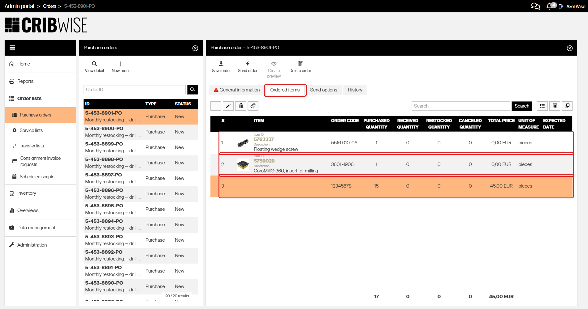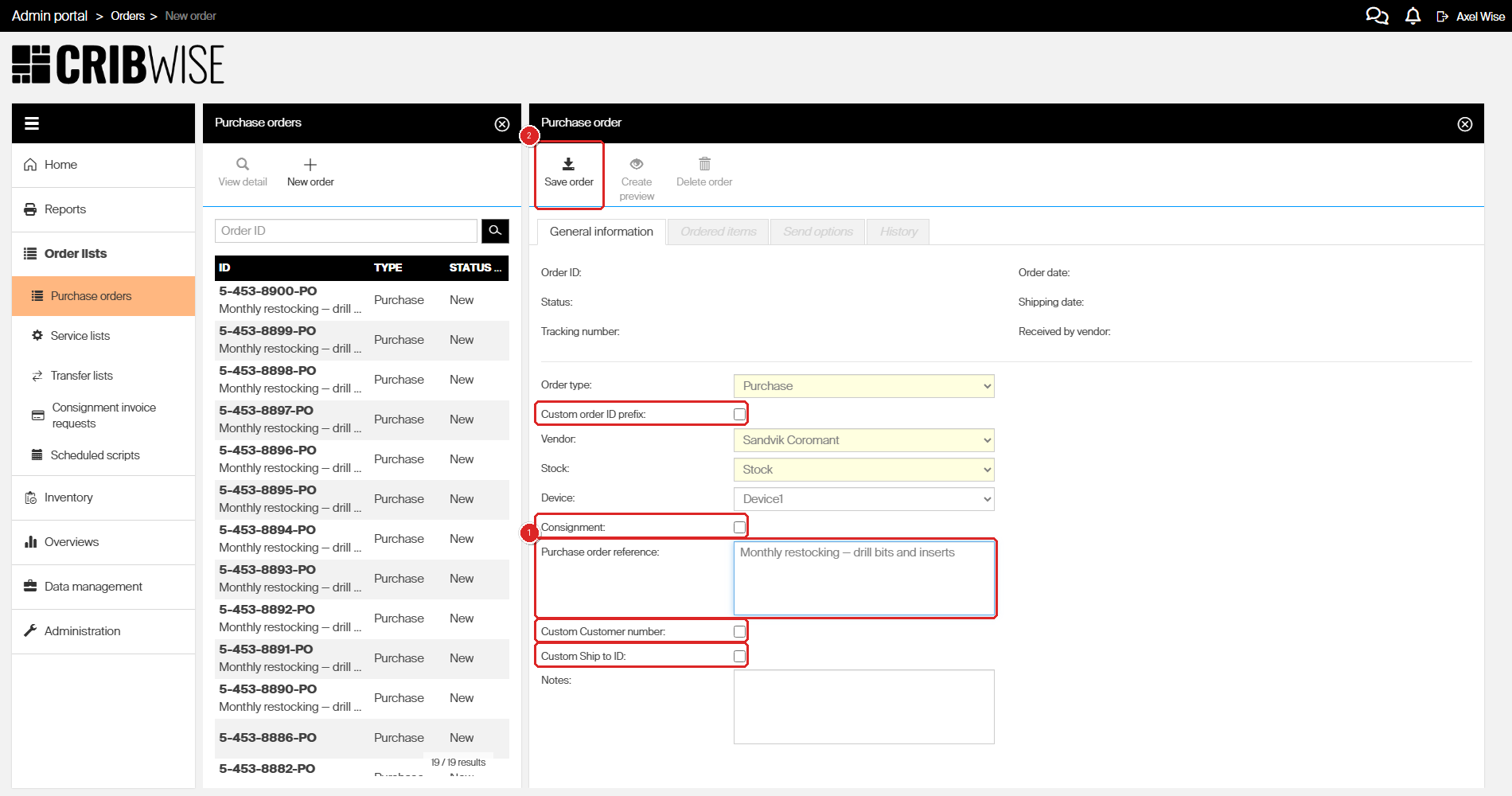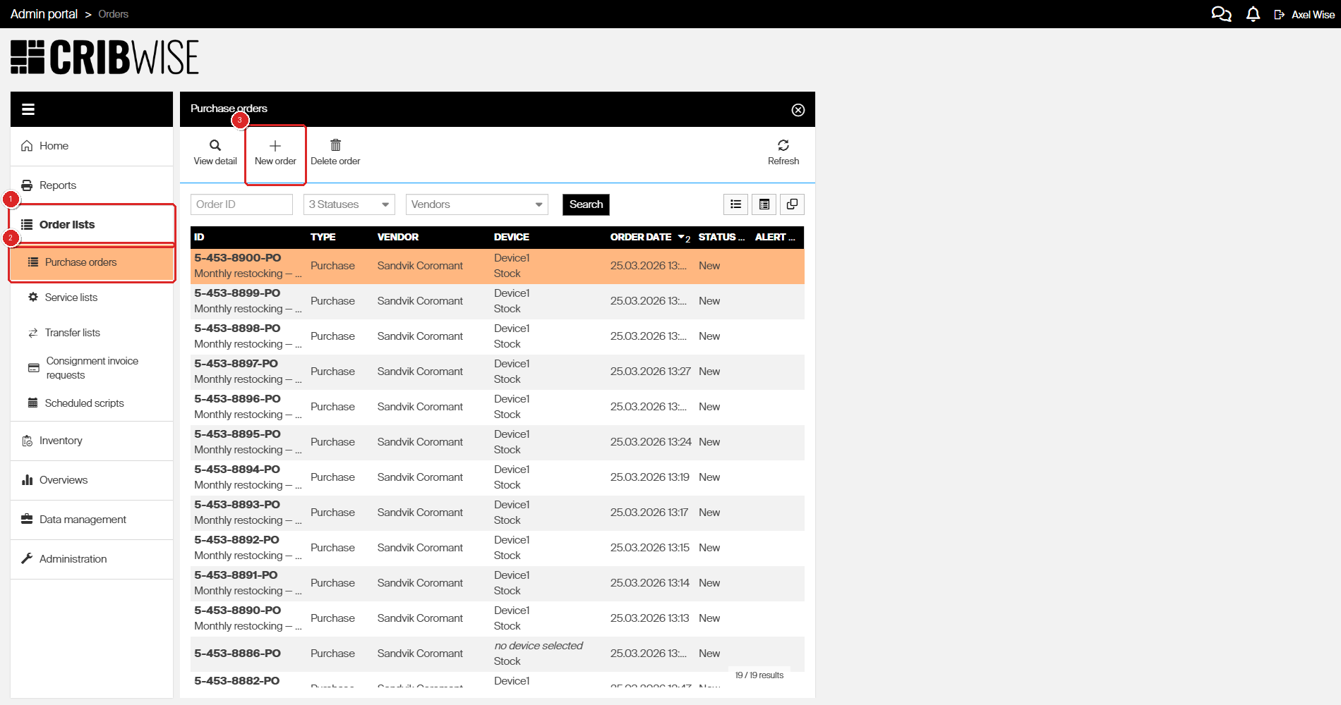 Admin Portal sidebar with Order lists expanded and Purchase orders selected, and New order button in toolbar