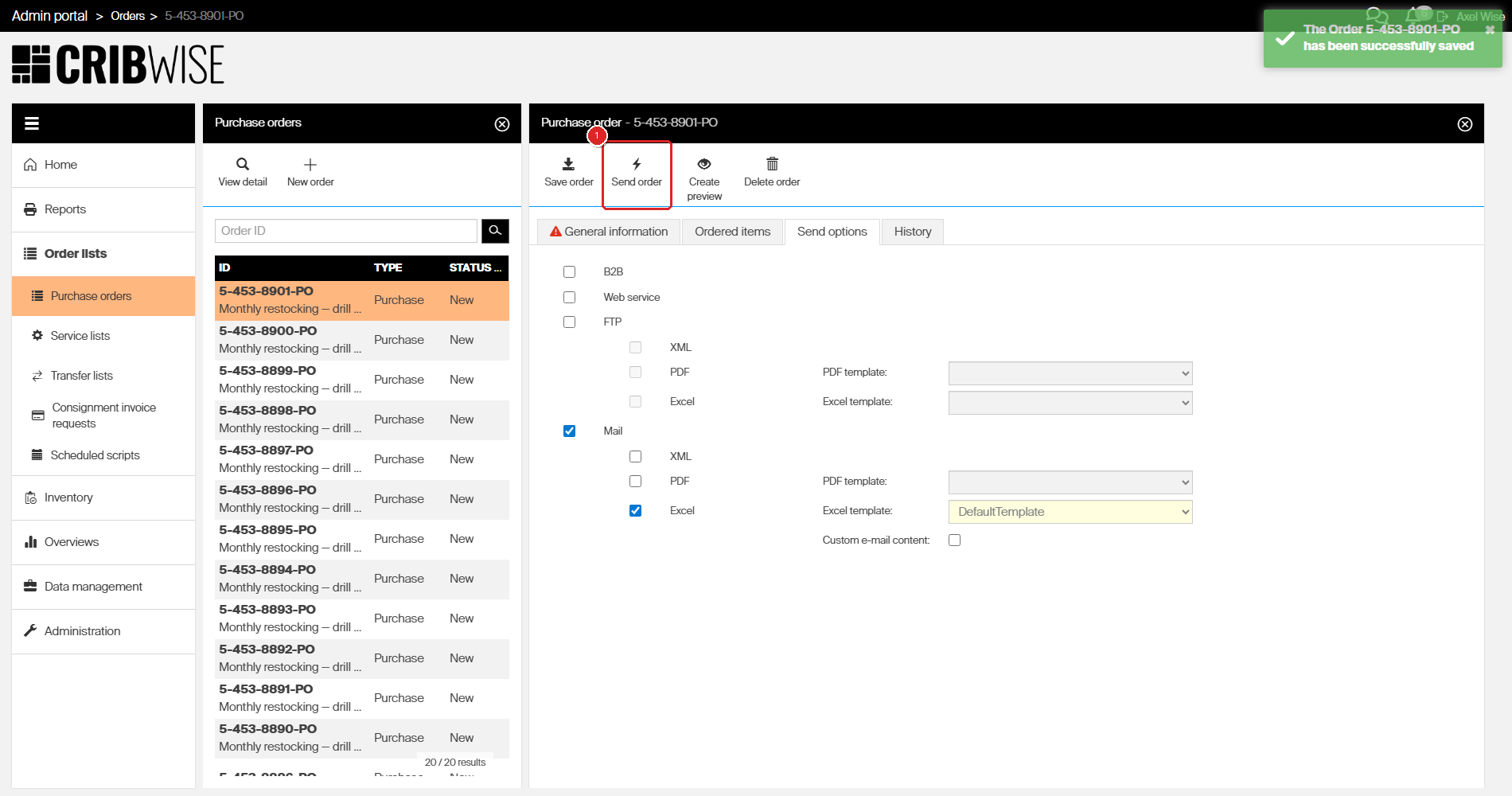 Success: The order appears in the purchase orders list and the vendor receives the order via the configured delivery method.