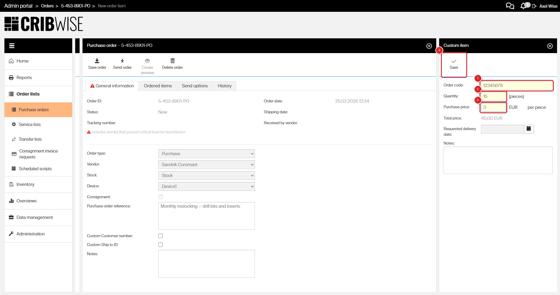 Fill in Order code (1), Quantity (2), Purchase price (3), then click Save (4).