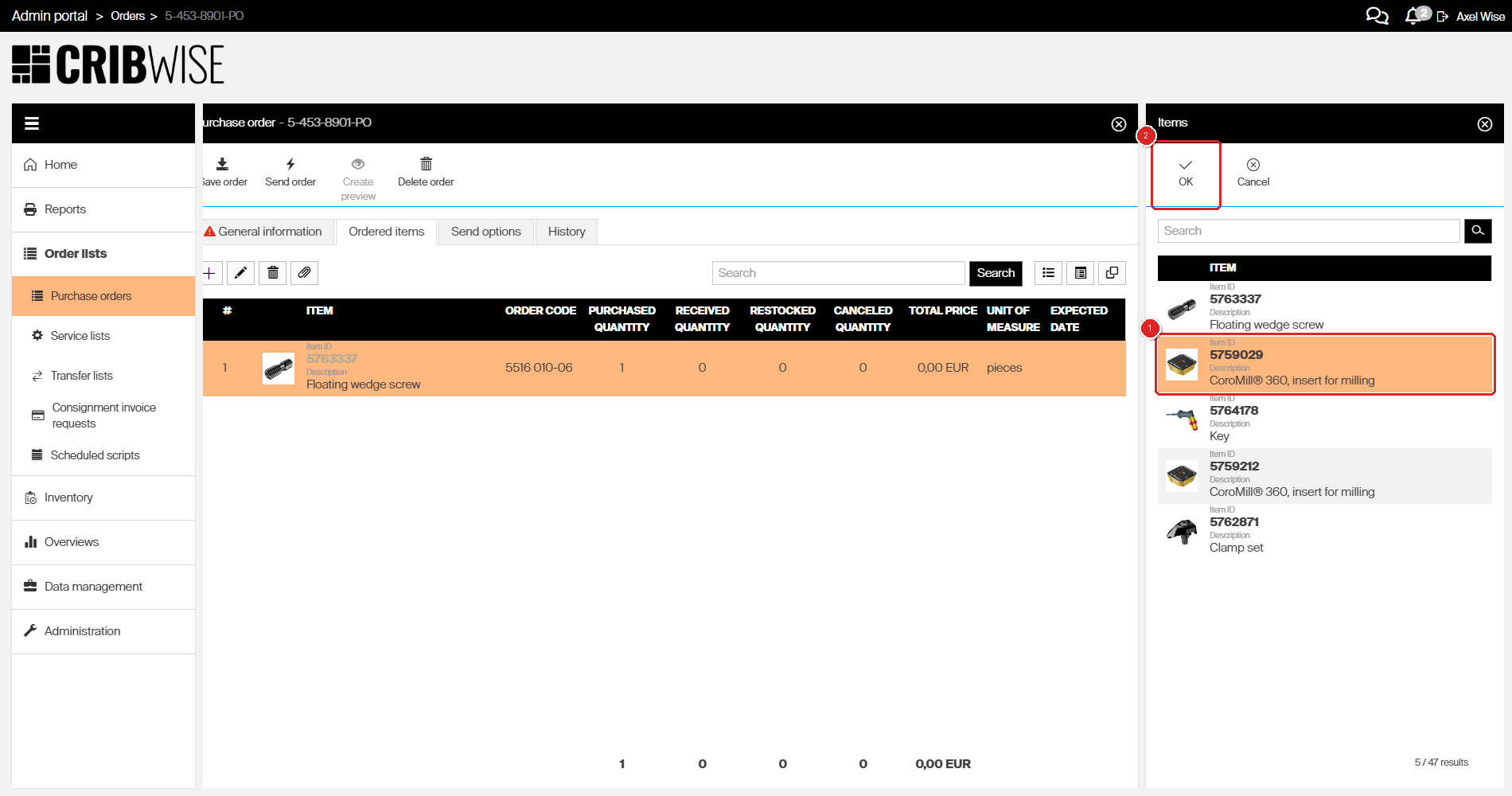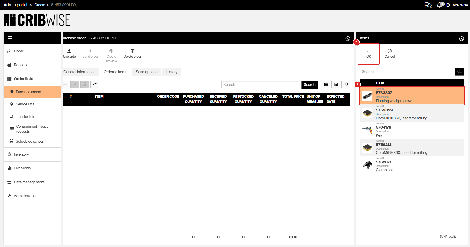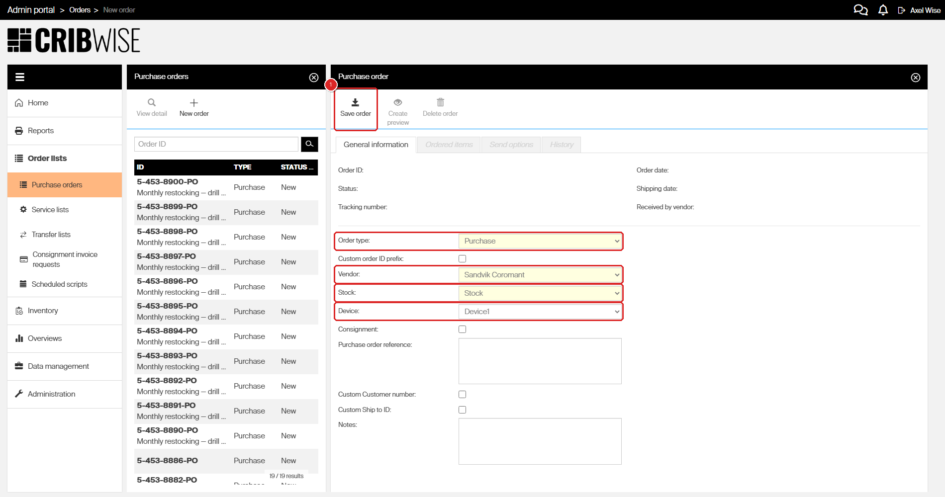 Filled form with Order type Purchase, Vendor Sandvik Coromant, Stock Stock, Device Device1