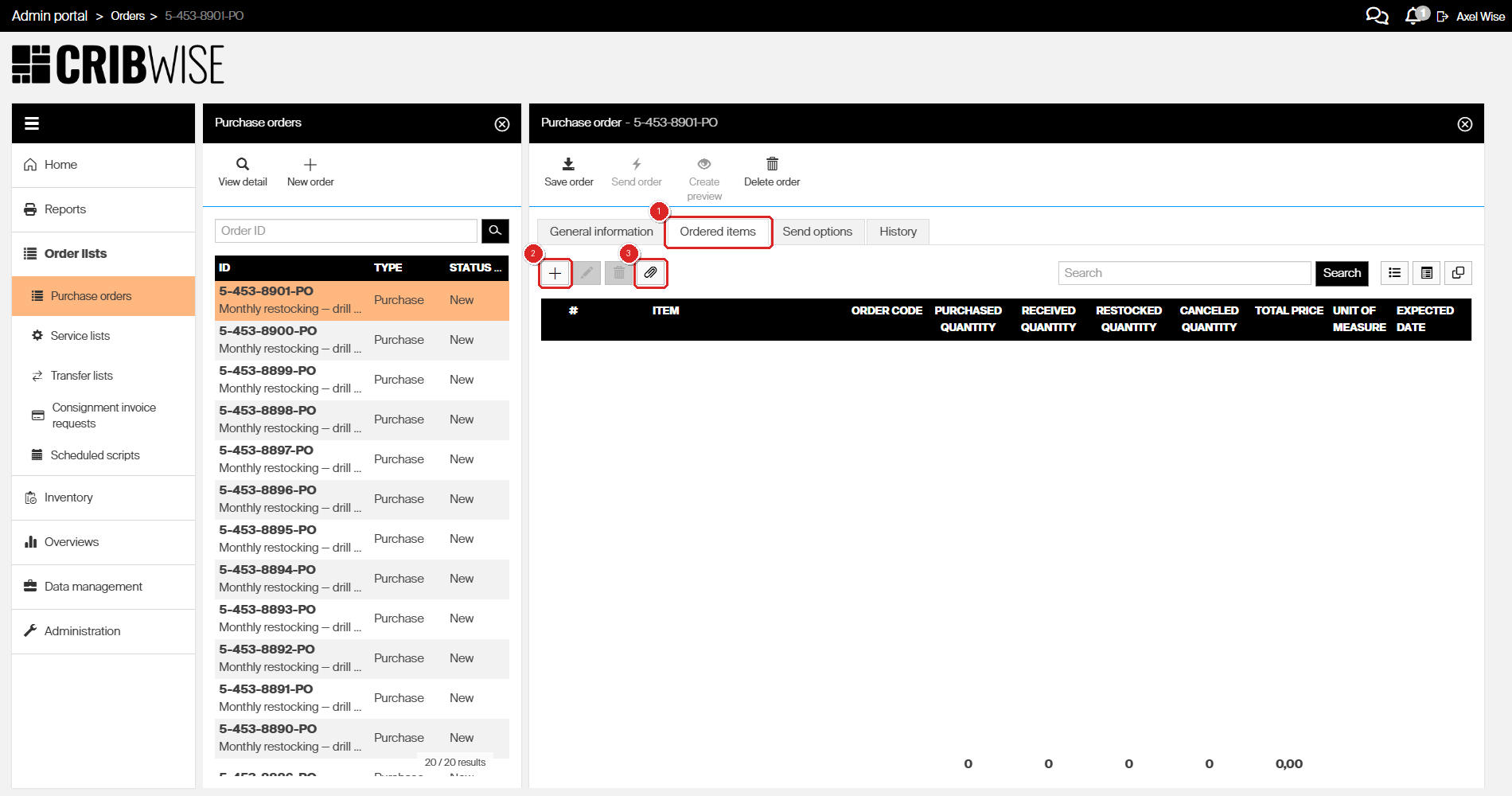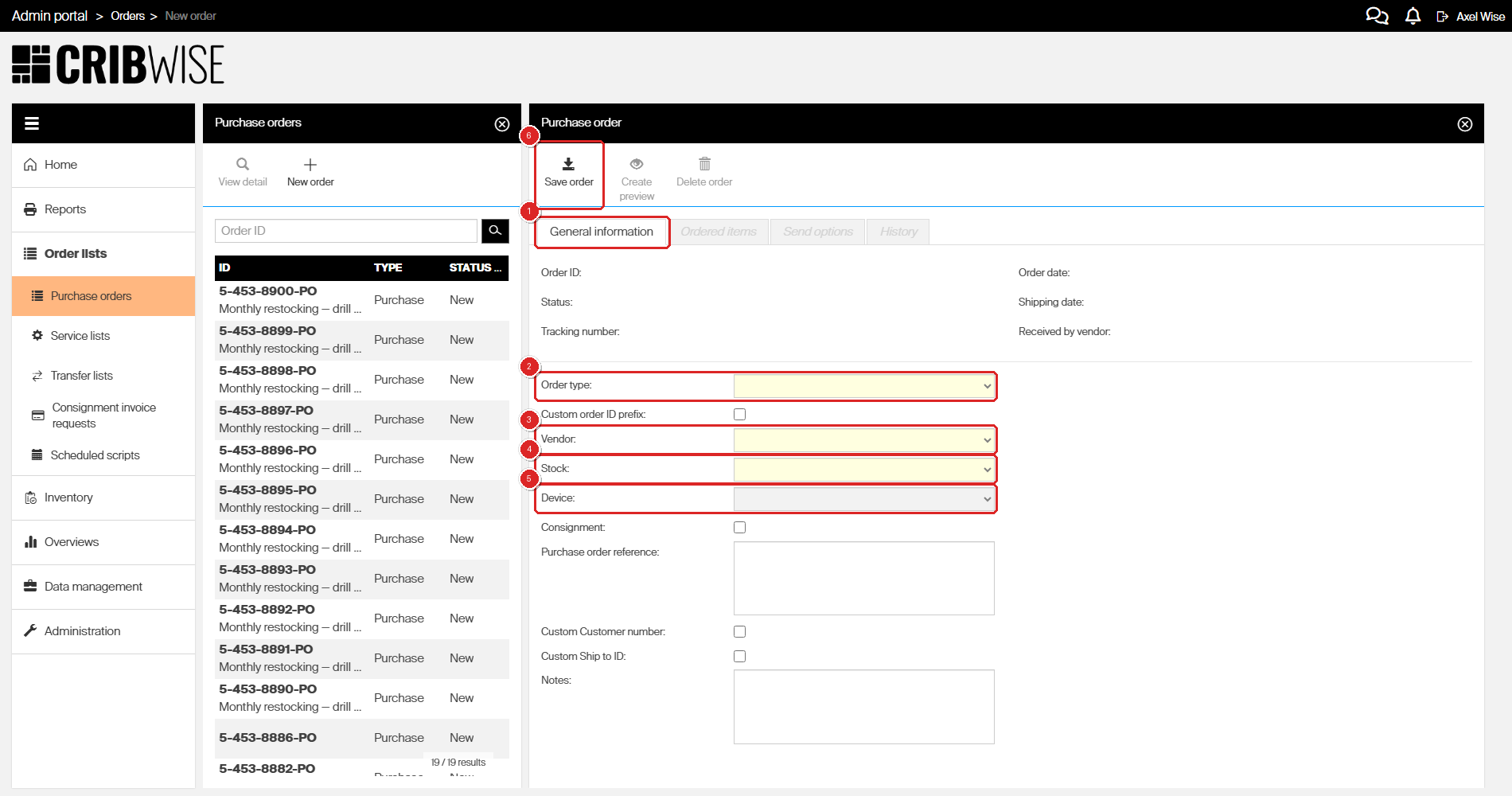 Click Order lists (1), then Purchase orders (2), then New order (3) to begin.