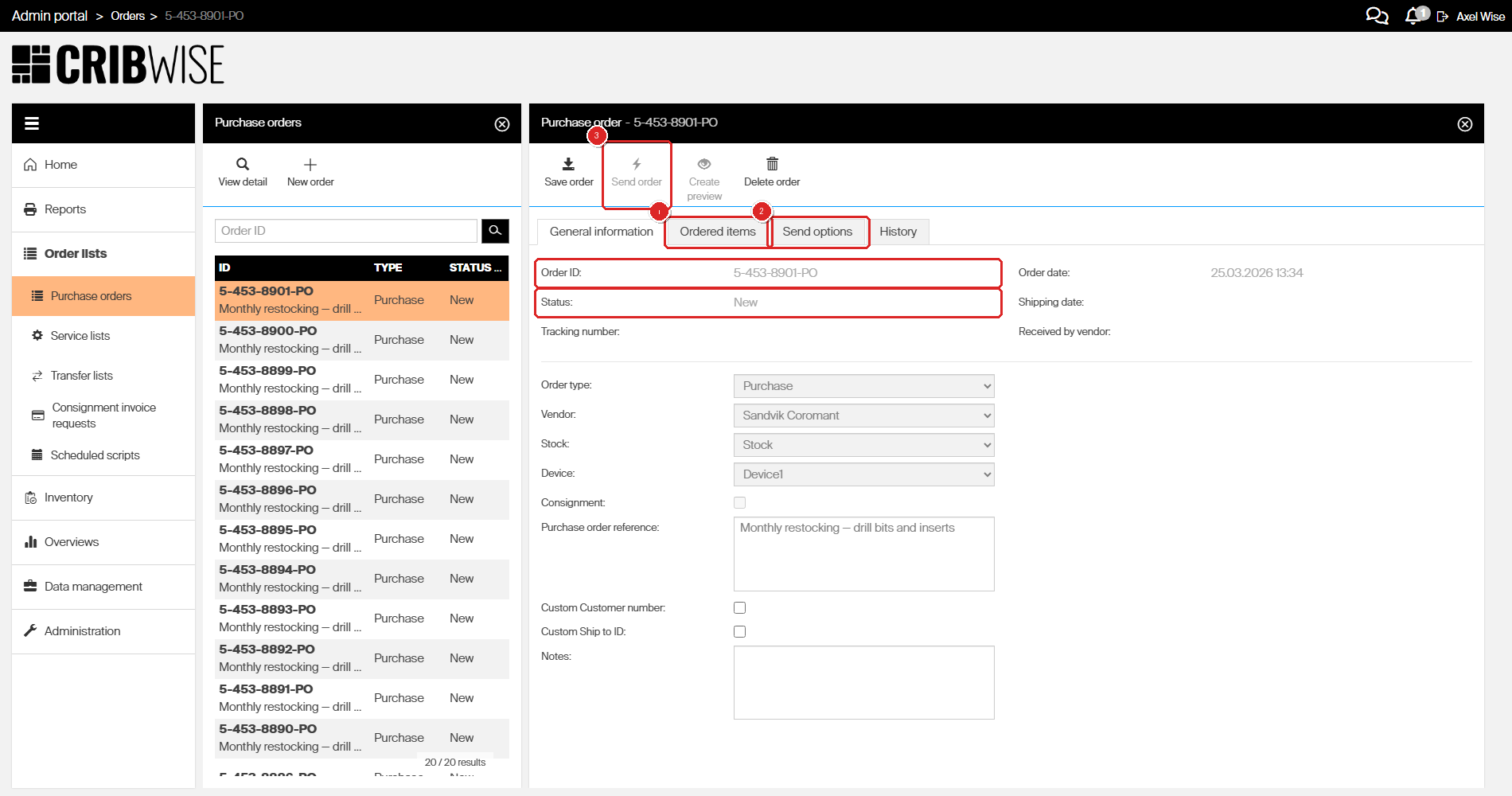 After saving, the order gets an ID and status New. Switch to Ordered items (1) to add items, finalize the order by setting format and delivery method in Send options (2). The Send order button (3) becomes available.