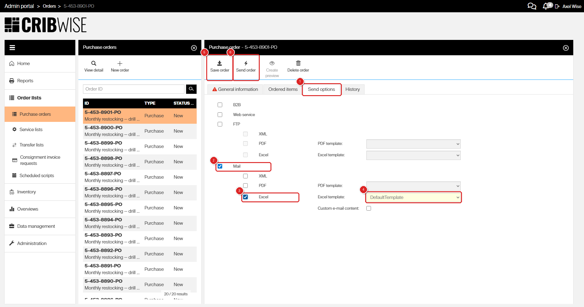 The Send options tab (1). Check Mail (2) and Excel (3), select the template (4), then click Save order (5) before sending with Send order (6).