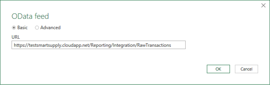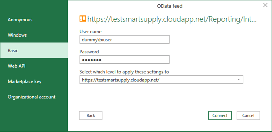 - Select Basic authentication and enter user information for user with privilege BI user. User name must be in format customerShortName\UserName. Select to Connect
