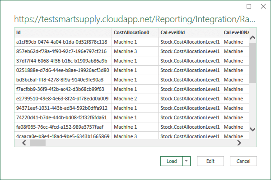 { "@odata.context": "string", "value": [ { "Id": "string", "SnapshotDate": "2019-03-11T13:22:04.609Z", "LocationAssignmentRuleId": "string", - enum (“NotUsed”, “Used”, “Refurbished”, “ForService”) "LocationAssignmentRule": "string", - value translated according system language "ItemType": "string", "StockId": "string", "StockName": "string", "Quantity": 0, "Value": 0, "OneMonthAgoValue": 0, "TwoMonthsAgoValue": 0, "Consumption": 0, "AverageConsumption": 0, "Turnover": 0, "TimeStampYearMonth": "string", "IsAssembly": true, "IsSerialized": true } ] }