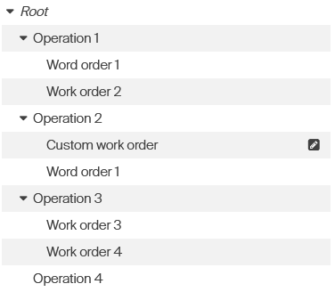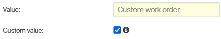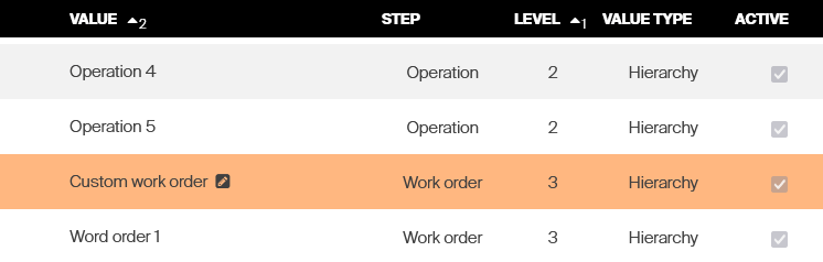 In the example, custom value will be available for second hierarchy step (Work order) only when Operation 2 is selected as the first hierarchy step (Operation). It is possible to set item, user or user group restrictions for the value in hierarchy. These restrictions work similarly to standard values and can restrict only specific items to be picked when custom value is entered or can set only specific users, which will be able to enter the custom value.