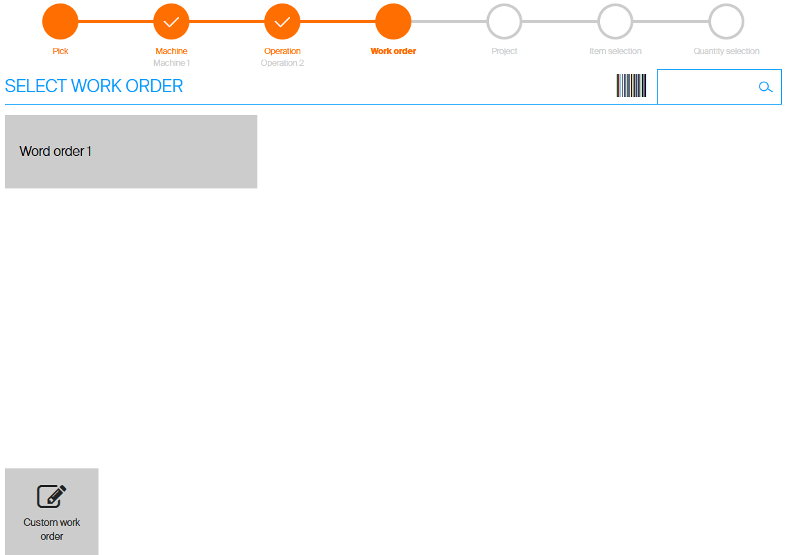 When operator starts pick flow, CA step allowing to enter custom value will show option to enter it. Label of the option is determined by name of the custom value specified in Admin Portal (Custom work order in example below). From here, operator can decide to select from list of standard values or to enter the custom value.