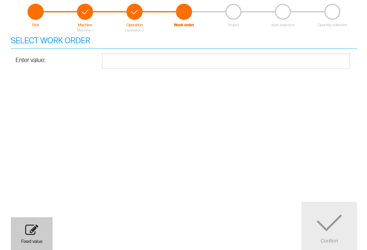 By selecting the custom value, text input is shown, allowing the operator to enter a value by keyboard or by external accessory (similarly to text steps). Operator can confirm the value to proceed to the next step or to return back to list of predefined values.