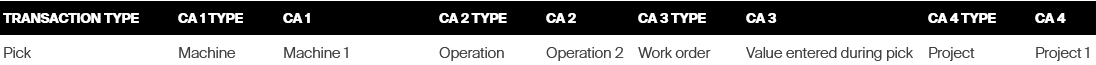The custom value entered during picking is shown similarly as any other value selected during picking. In reporting, value entered by operator will be shown as value selected for a step. Finishing pick from example above, following transaction will be generated, assuming that operator entered “Value entered during pick” as a custom value for step Work order.