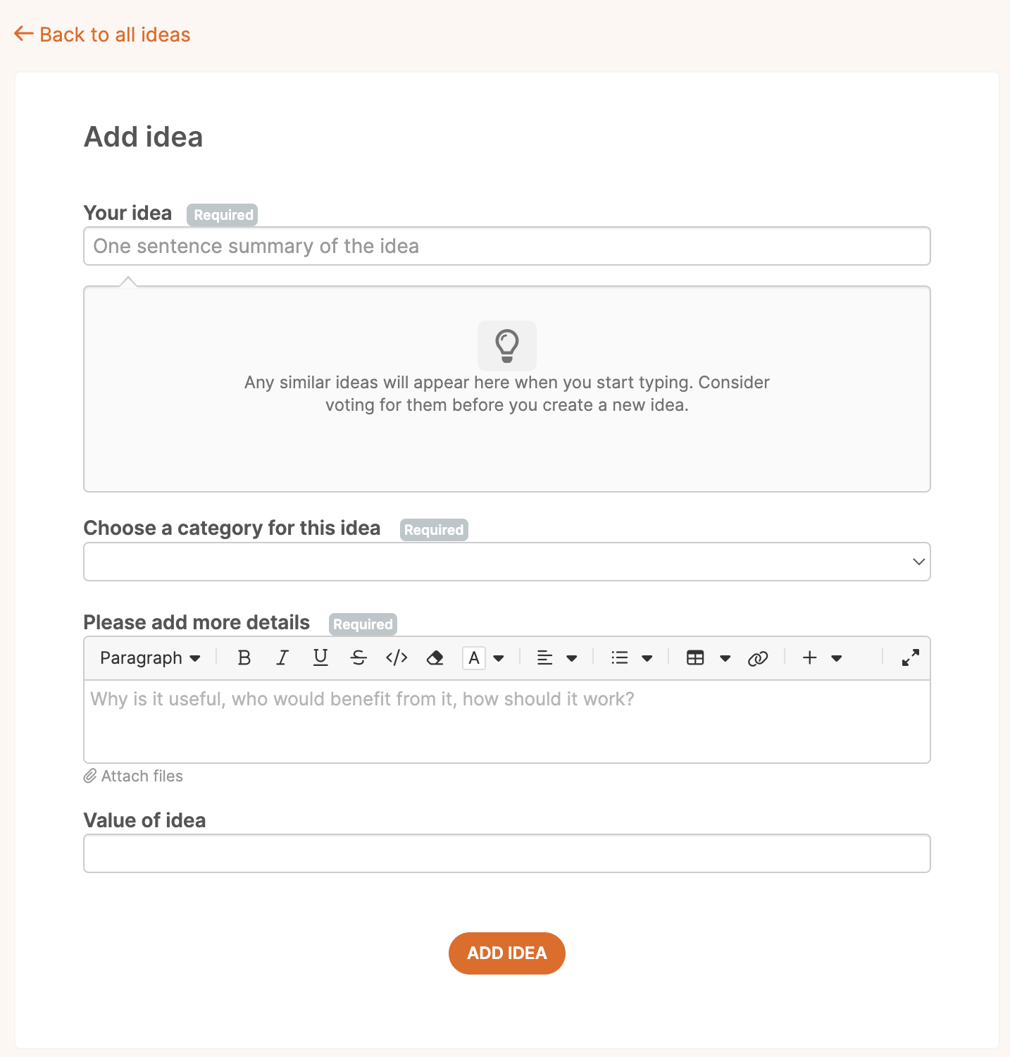 - Start filling in the form. When you start typing the name of your idea you will see a list of other similar ideas pop-up in the window below that you might want to read first to not create duplicates