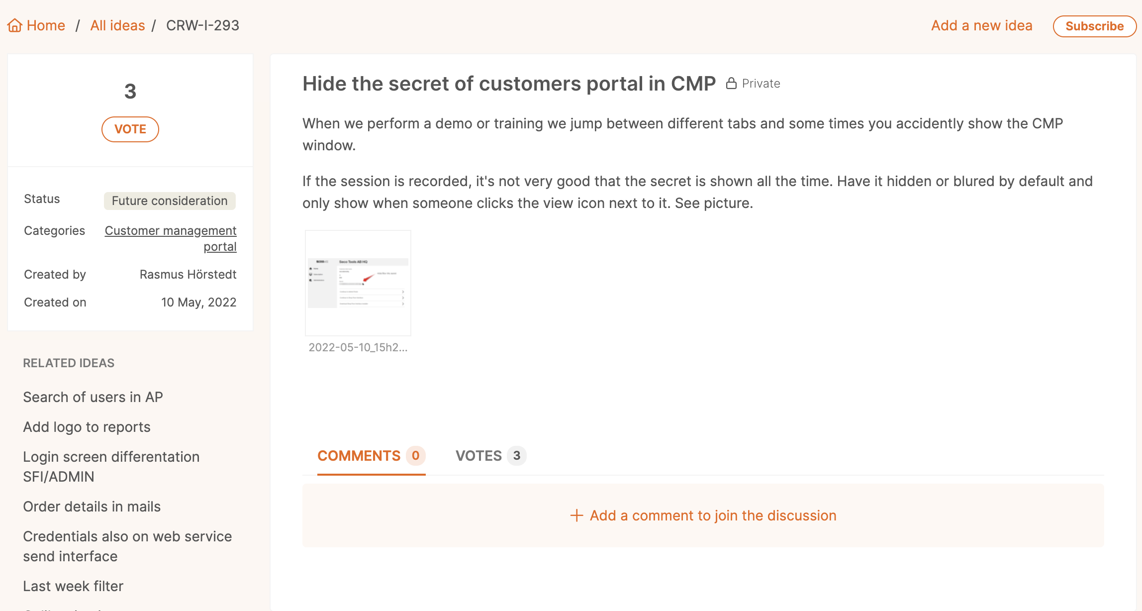 - Ideas are directly synched to our features backlog and creator of idea will get notifications on changes