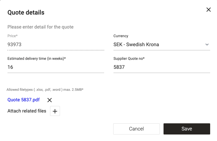 Once the supplier answers the quote, a pop-up will be displayed with the possibility to upload an offer (PDF document with a reference number). This reference number will be displayed in the quote details page, together with the customer quote request id.