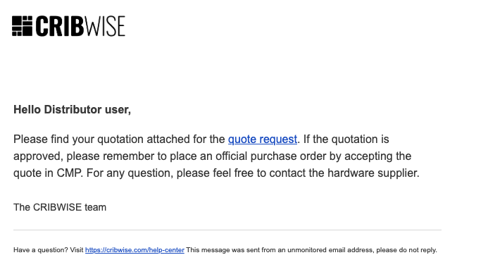 The hardware quote will be valid for 30 days. The quote will have the status Waiting answer (the supplier is waiting for an answer from the distributor). CMP will automatically trigger an email to the quote requester with the quote.