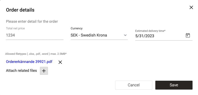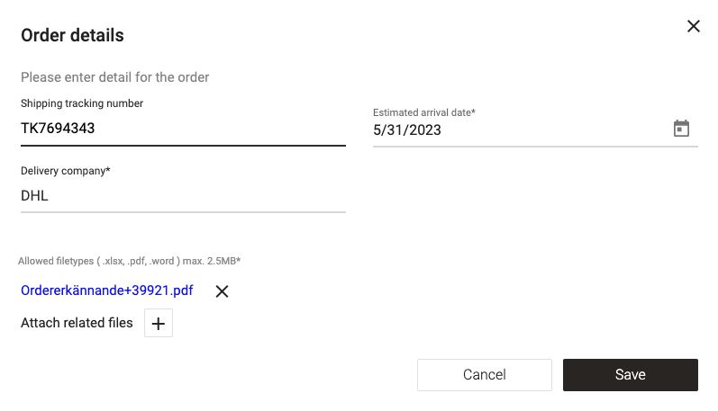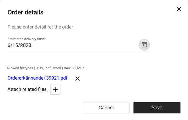 After the supplier confirms the order, they can update the estimated delivery date by pressing the “Update ETD” button. A pop-up will be displayed, and the user can update only the date. The user will be able to upload files also. The “Save” button will trigger the status change for the order and to ETD updated an email will be sent to the requester (the distributor that placed the order).