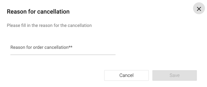 The supplier user is the only user that can cancel a hardware order. They need to fill in a cancellation reason (mandatory) and the distributor will be notified about the cancelation.