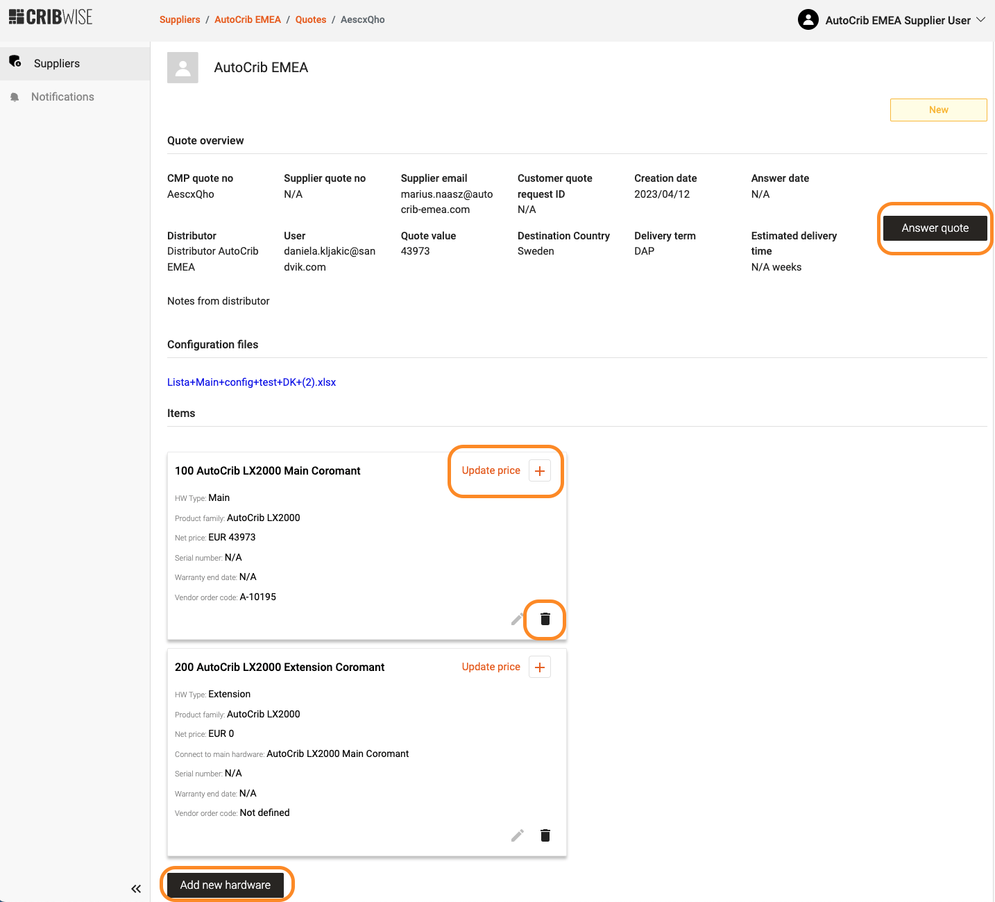 The distributor can request a hardware quote from the supplier for their customers. The quote will have status New. Once the quote request is registered, both the distributor and the supplier will get an email notification with the quote details. You can see all the quotes by clicking on the Quotes tab.