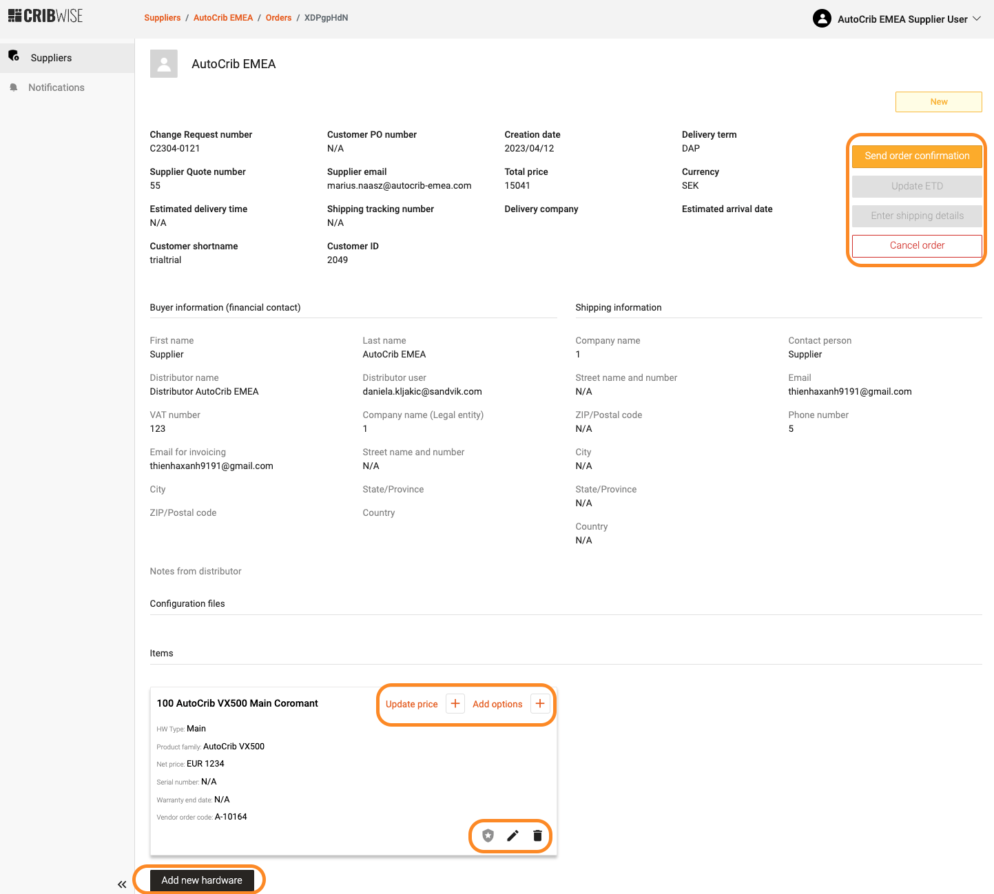 The distributor can order hardware for their customers directly from the supplier. An order can be placed for a main unit, for extensions, options, spare parts and accessories and must be from the same hardware supplier. If the user wants to order items from different suppliers then they need to add multiple orders.The distributor will not be able to change the order after it’s placed. Only the supplier can make changes or cancel the order.Once a new order is registered, the hardware supplier will receive an email.