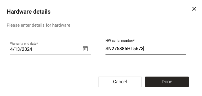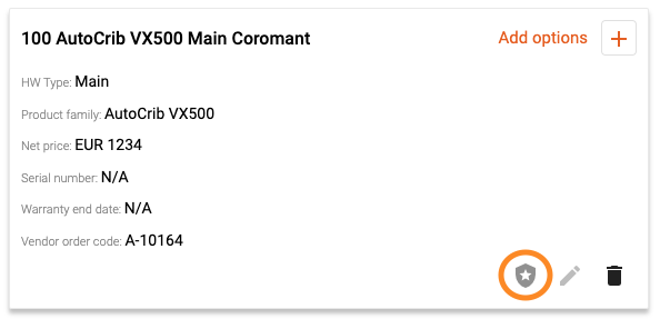 To complete the shipping, the supplier needs to fill in the hardware serial number and warranty for all serialized items. To do that, they need to click on the icon on the item card and a pop-up will be displayed.