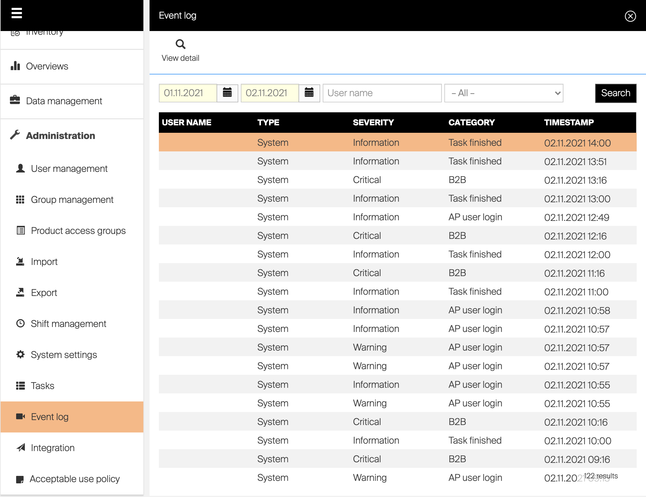 Event log shows all system related events in selected time period.
