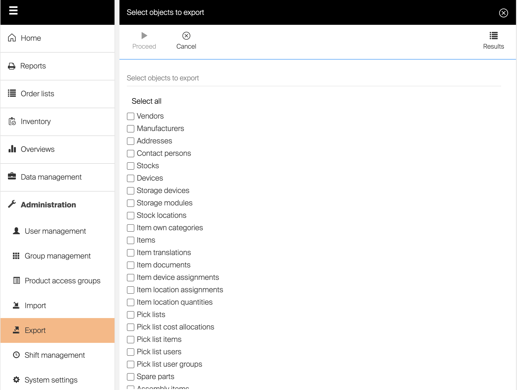 - Select objects to export – for each selected object sheet can be found in exported file. If only one object is selected, selection of specific columns can be performed. Otherwise all columns will be exported. Selection is confirmed by pressing Proceed