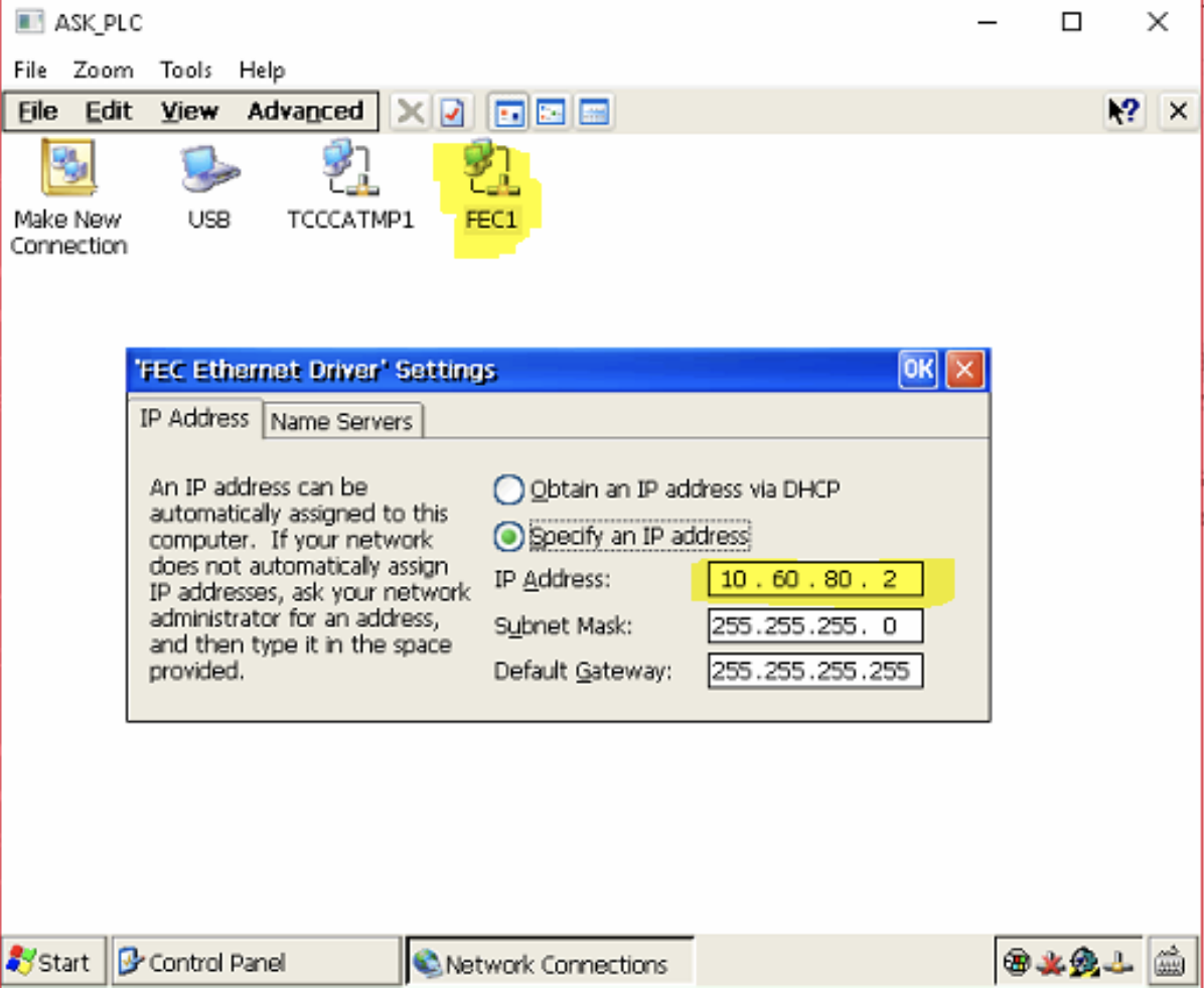 3. Once connected to the Windows CE running on the PLC, go to Start -> Control Panel -> Network and Dial-up Connections