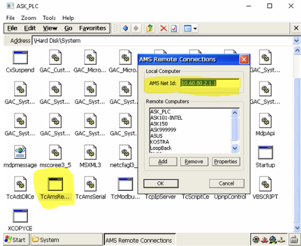 6. Now open Start -> Programs -> Windows Explorer and navigate to Hard Disk -> System and start application named TcAmsRemoteMgr.exe. In the application change the AMS Net Id to match the IP address of the extension cabinet, i.e. for example from 10.60.80.12.1.1 to 10.60.80.22.1.1 and press OK to close the application.