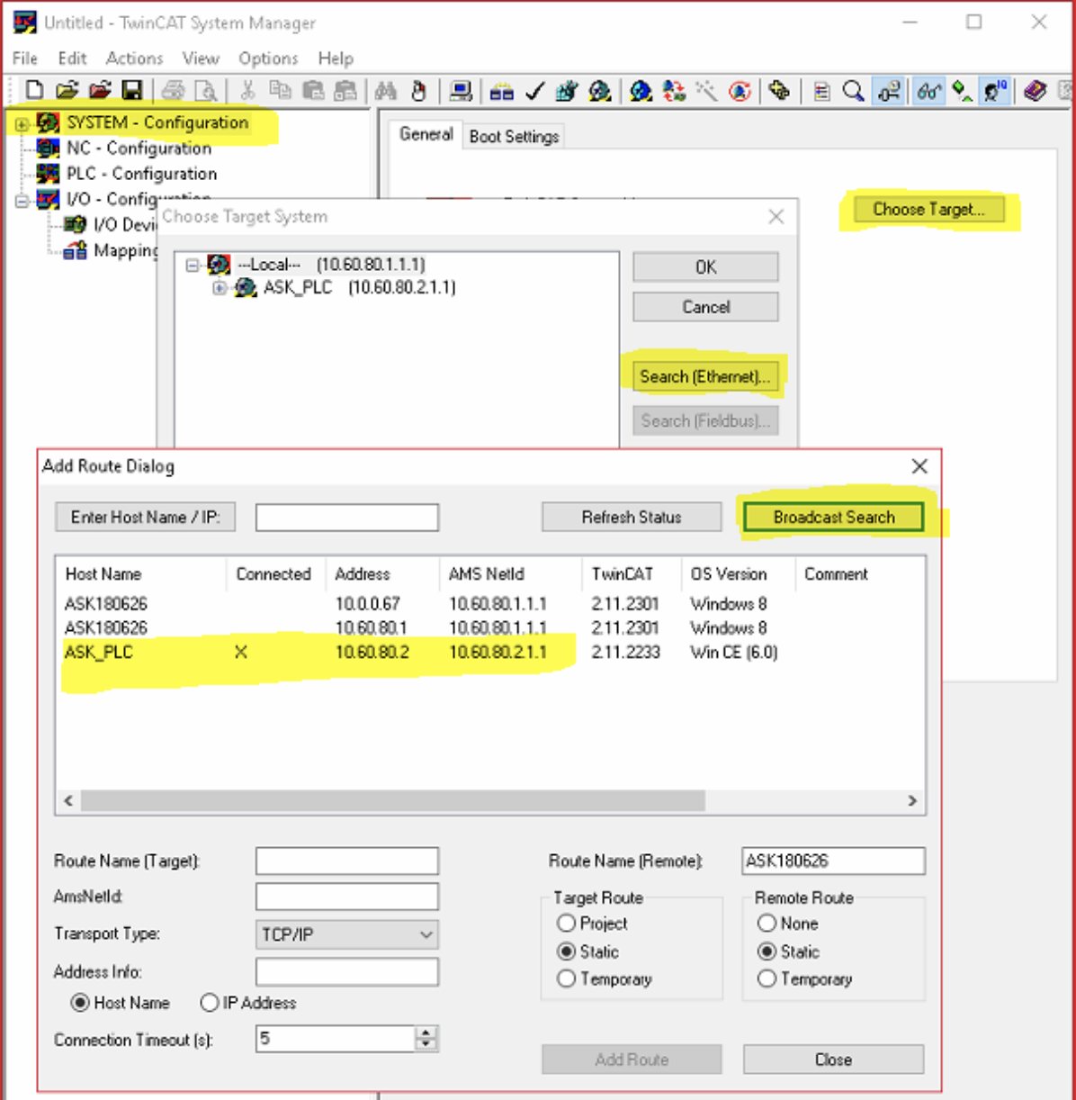 2. In the opened application navigate in the left tree to SYSTEM – Configuration, by pressing Choose Target button open Choose Target System window and using Search (Ethernet) button open Add Route Dialog. In the dialog press Broadcast Search button