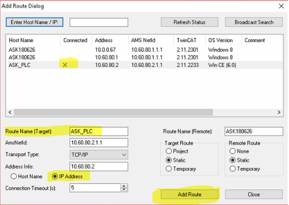 4. Select this entry in the grid, and in the bottom part of the window fill up the name of the route (for example to ASK_PLC_22), switch the option box from Host Name to IP Address and press Add Route button which should setup this route and the X should appear the Connected column.