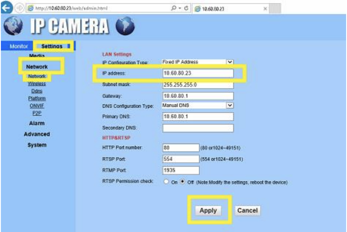 4. On the main view navigate to the Settings in the left pane, select Network from the menu and then Network again from the submenu. In the page that appears on the right side change the IP address of the camera to new IP address (for example 10.60.80.23) and press Apply button to save the changes.