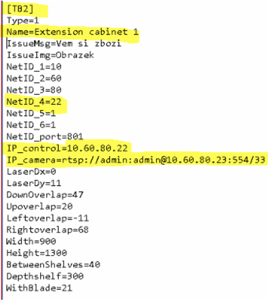 2. Locate section marked with [TB1] and copy all the configuration fields to the newly created section named [TBx] (replace x with next number in the sequence, for example 2). The number after TB here is the ID of the extension cabinet which should be then put to the Smart Supply slave cabinet configuration. Change the value of IP_control field to the new IP address of the extension cabinet (for example 10.60.80.22) and change value of the NetID_4 field to last number from the IP address (for example 22). Change values of the Name filed to something meaningful (like Extension cabinet 1) – this name is then shown in the ASK Control when doing configuration.