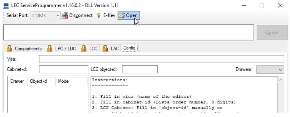 1. Run the LEC-Programmer.exe 2. Choose the identified COM Port 3. Click Connect