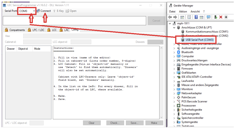 1. Run the LEC-Programmer.exe 2. Choose the identified COM Port 3. Click Connect