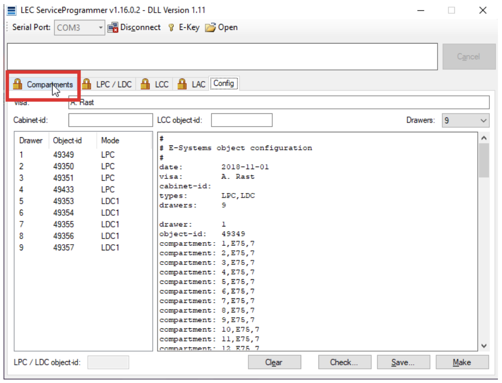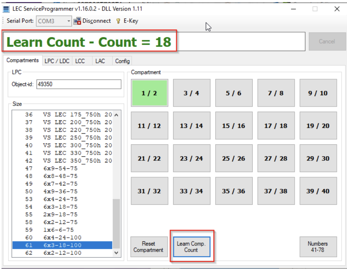 9. Highlight the right compartment type and click the button with the right compartment number. You can see the number of type in the config file. In this example is it the No. 61. Compartment 1 and 2 are of type 61. See above picture. Click on the affected lid.