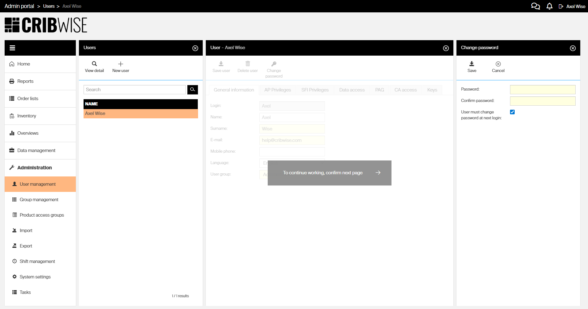 - Optionally enable User must change password at next login — this forces the user to set their own password when they next log in either on AP or SFI.