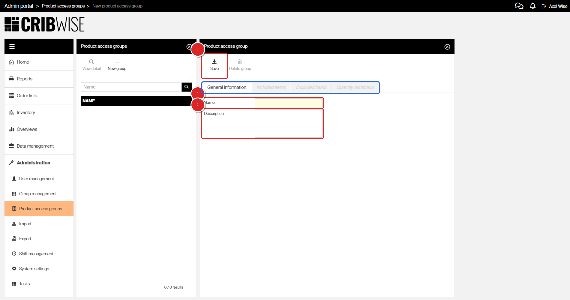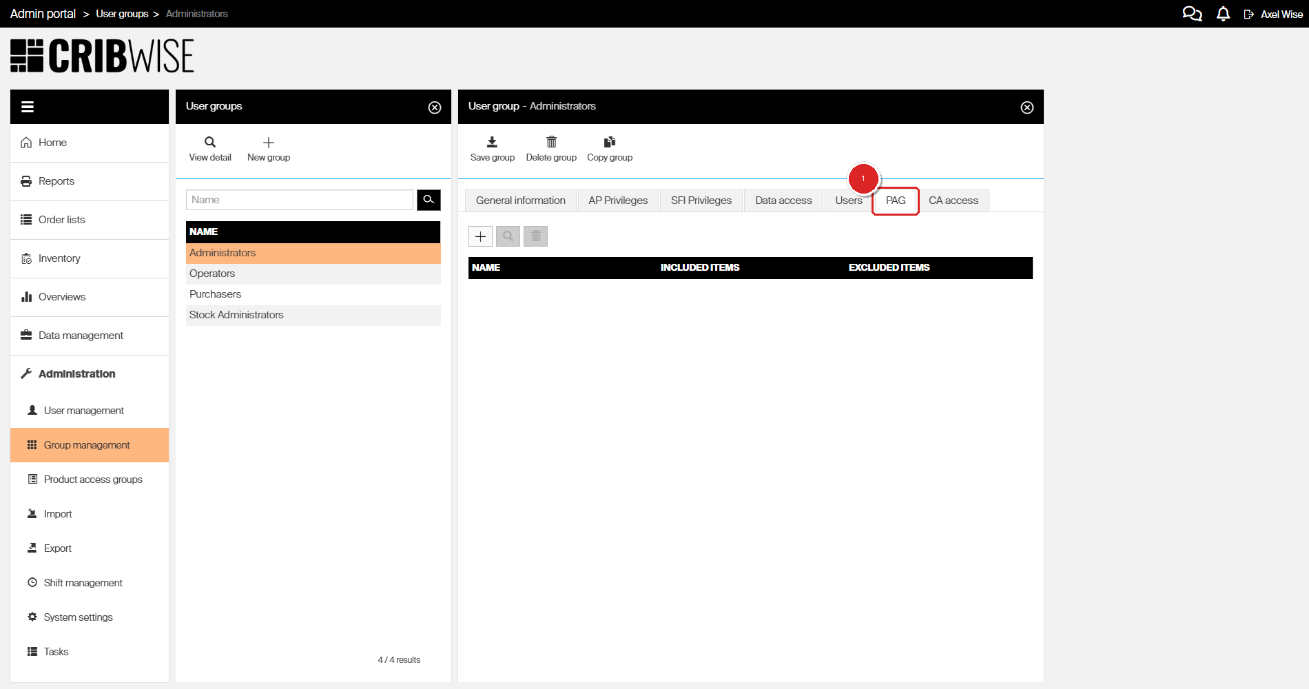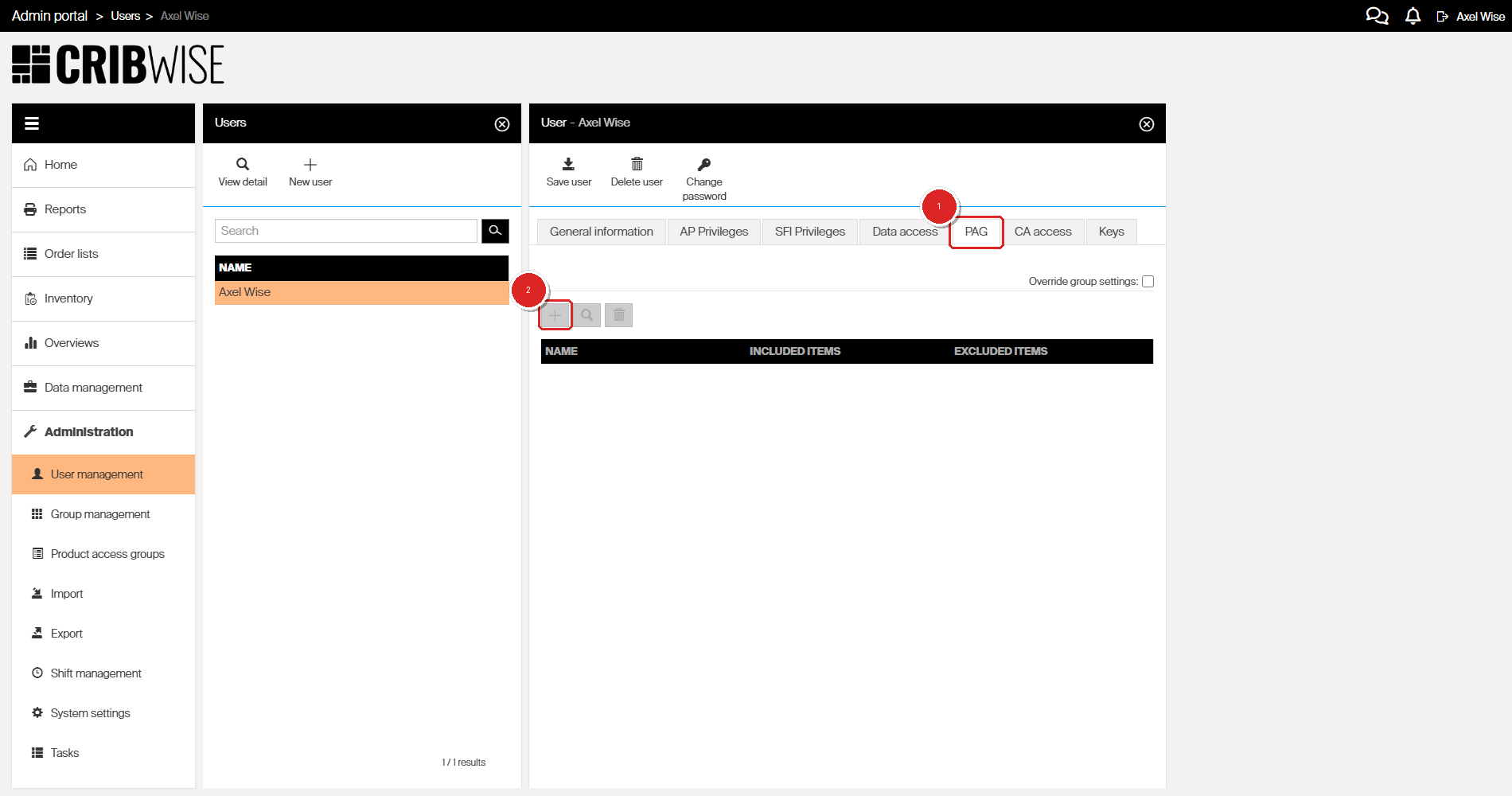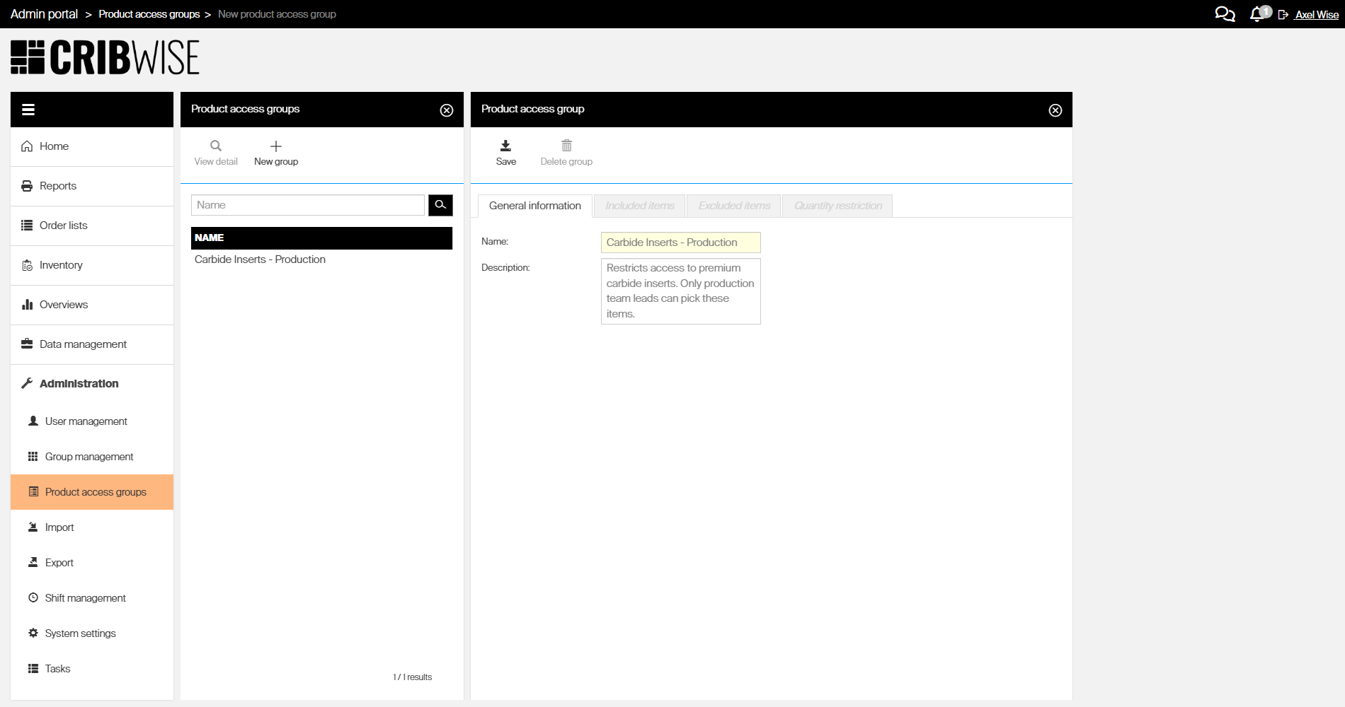 Control which items specific users or user groups can pick in CRIBWISE by creating Product Access Groups (PAG). Items can be included or excluded from available items for those users to pick. Items being included can have restrictions like quantity, time, or both.