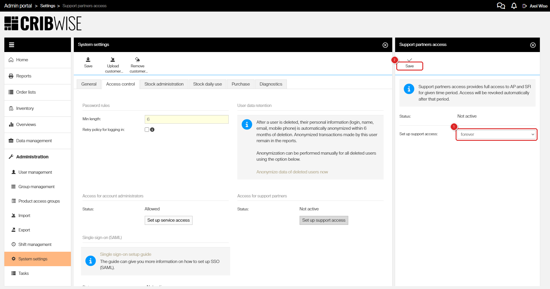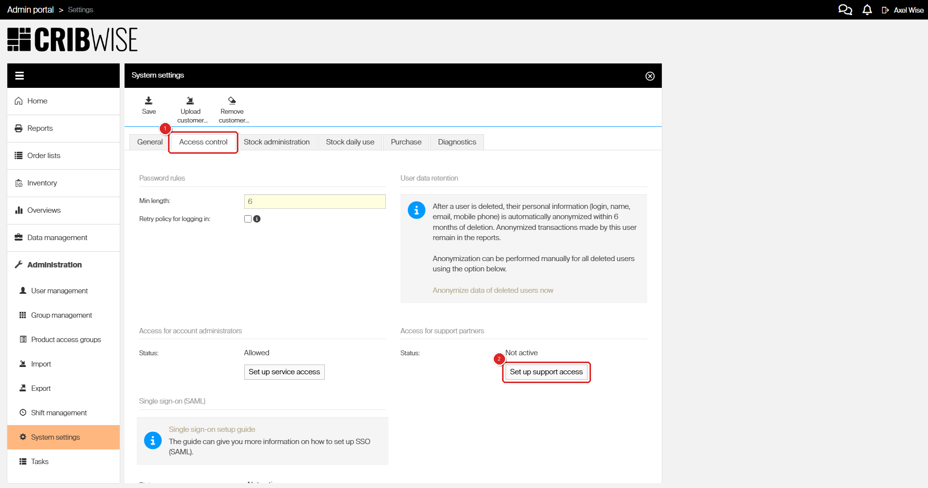 The page shows sections for password rules, user data retention, access for account administrators, access for support partners, and single sign-on.
