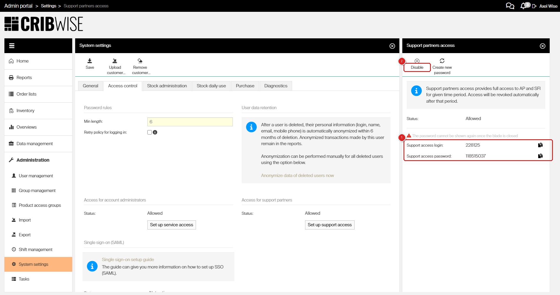 Support partners access panel showing (1) login credentials and (2) Disable button