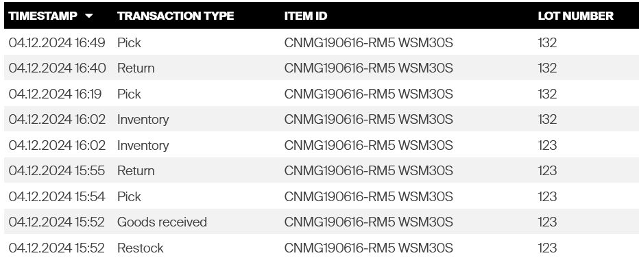 Lot tracking allows to track lot (or batch) numbers for selected items. Any transaction on tracked items will contain the number, so any movement of item (pick, return, restock…) can be related to specific lot or batch.