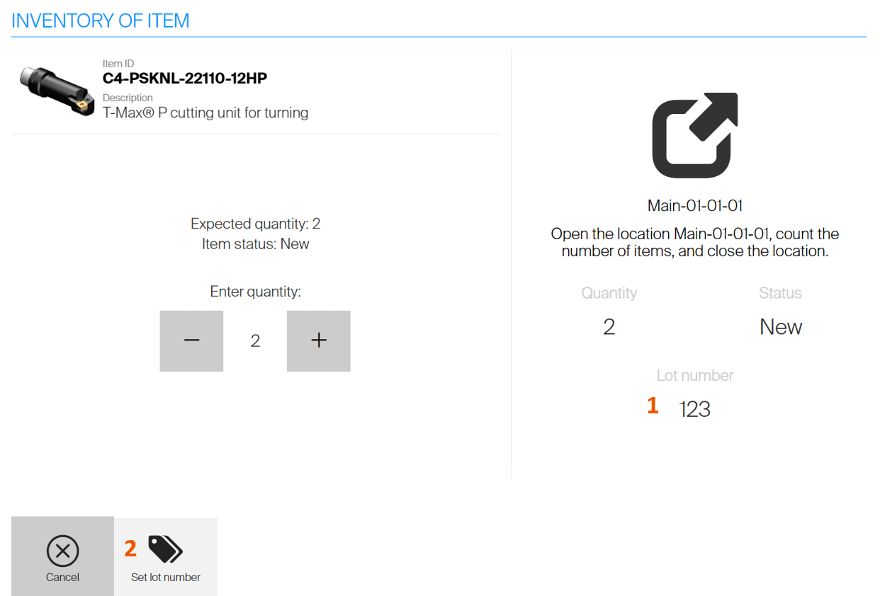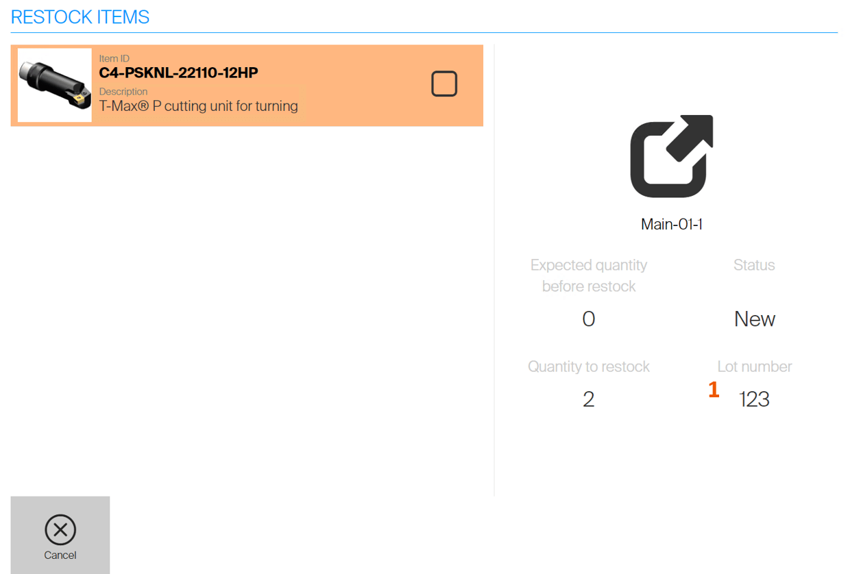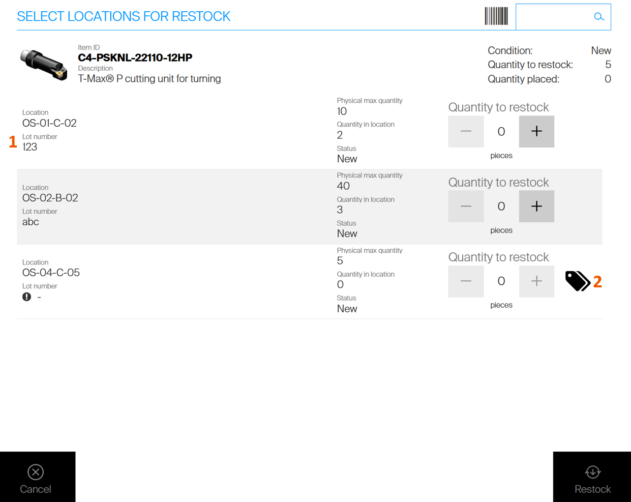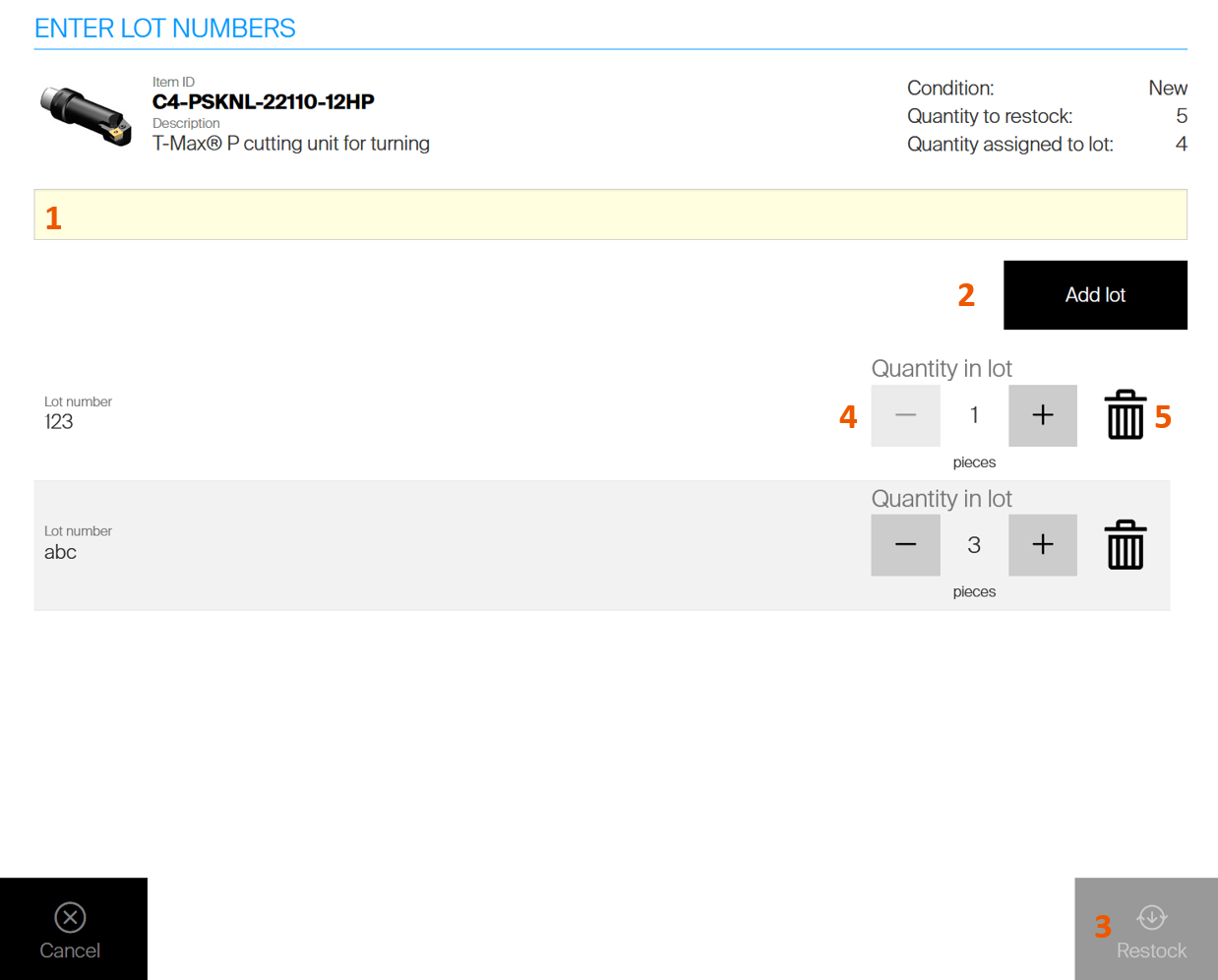 To proceed with restock of this item, all quantity selected to be restocked on the previous step must have lot numbers assigned. Enter lot number for the item (1) and confirm it (2).