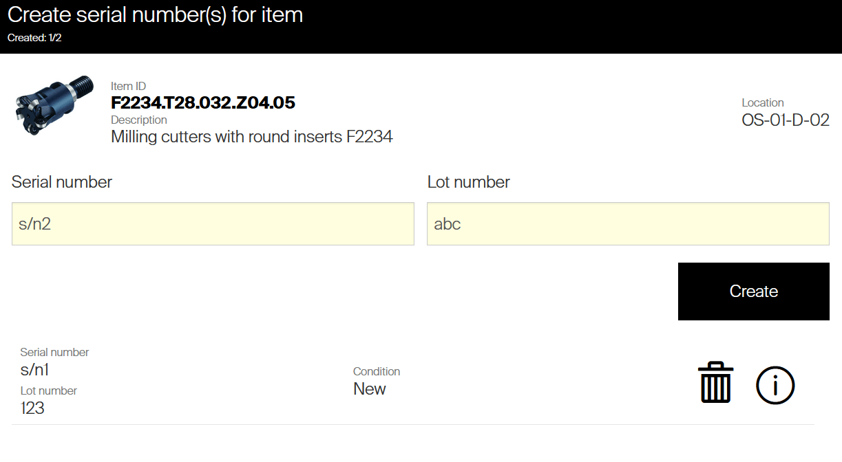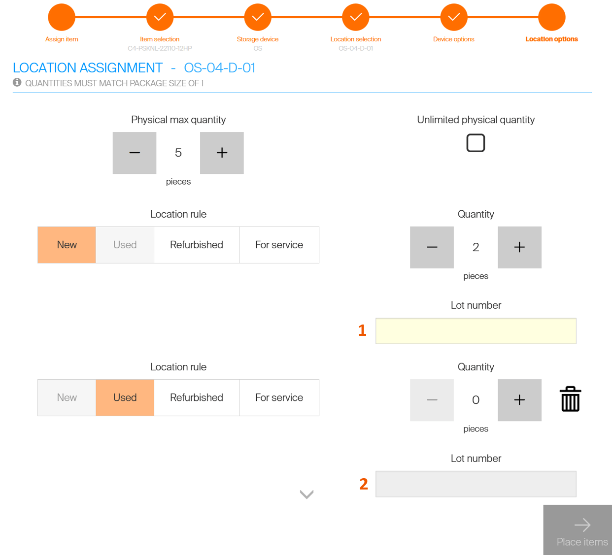 Tracking lots for serialized items will set lot number for each serial number specifically. Thanks to that, it is possible to place serial numbers of different lots to single location. Working with serialized items is further described in dedicated section of this article.