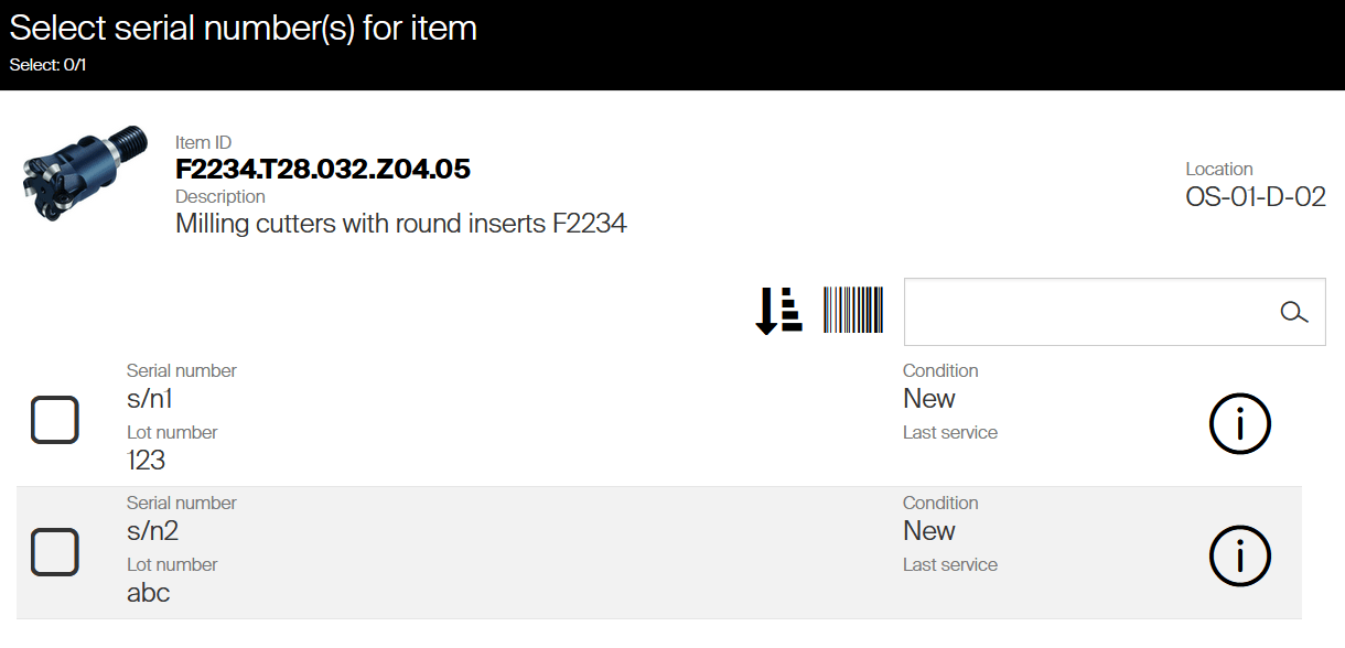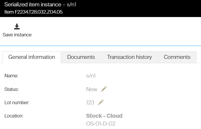 Navigate to Serialized items overview and click to the serial number, or open detail of the item and select the serial number from Serialized item tab.