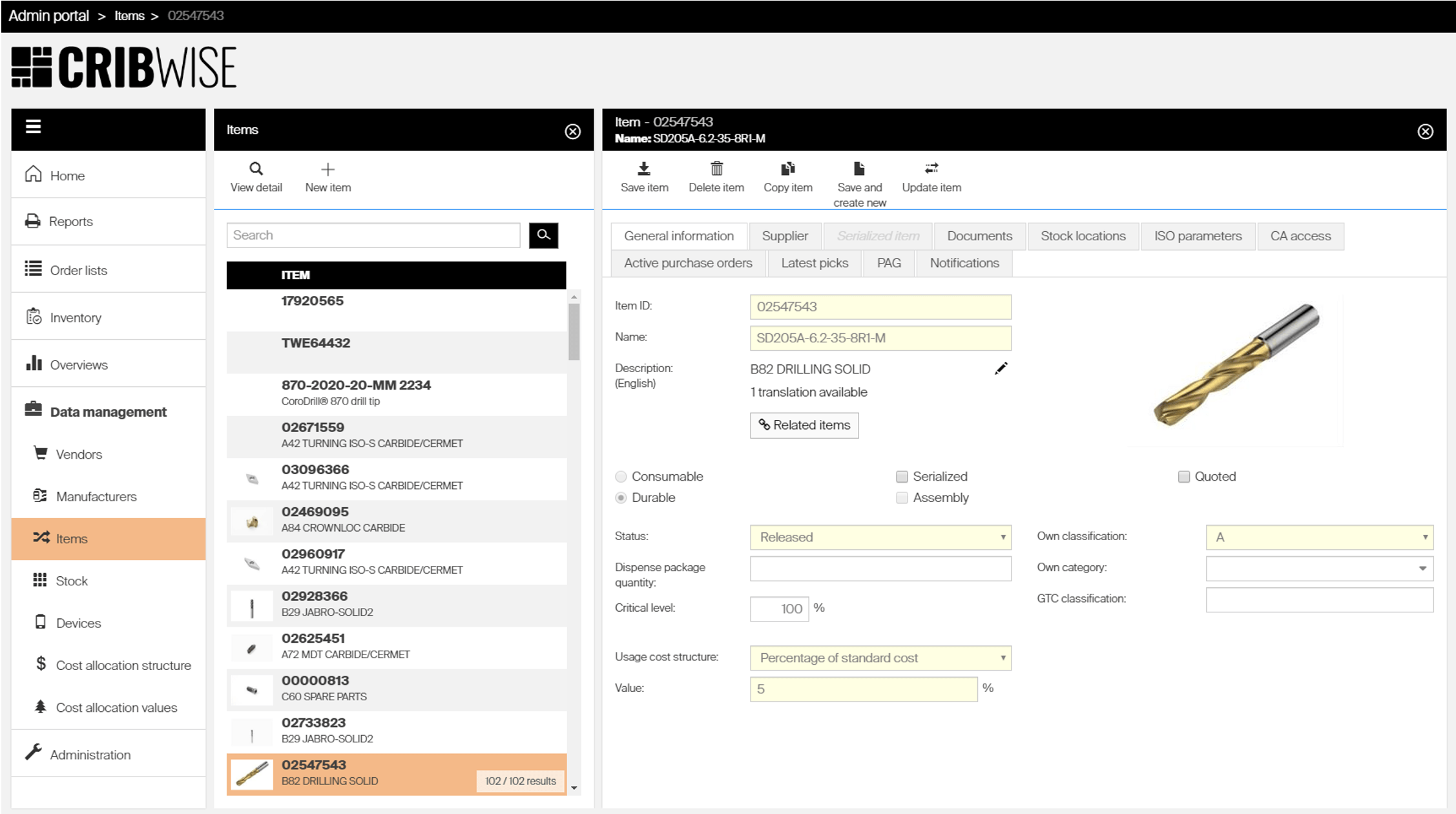 Management of items allows to create and maintain set of items available in the system, assigning items to stock locations to allow operations with them on physical devices through SFI application and track items usage and availability.