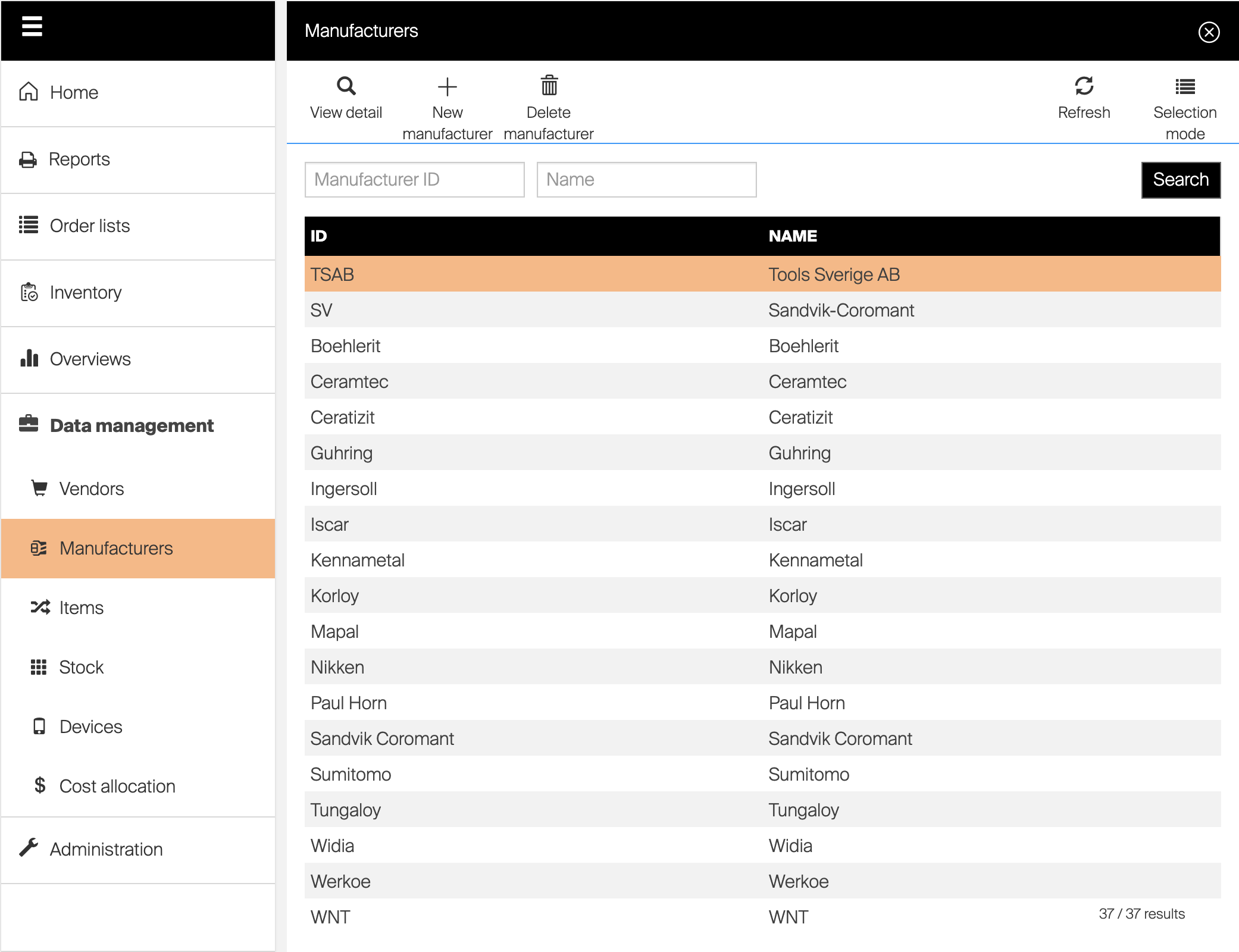 To start working with manufacturers, access Manufacturers option in Data management menu. On manufacturer list view following options are available to manage manufacturers: