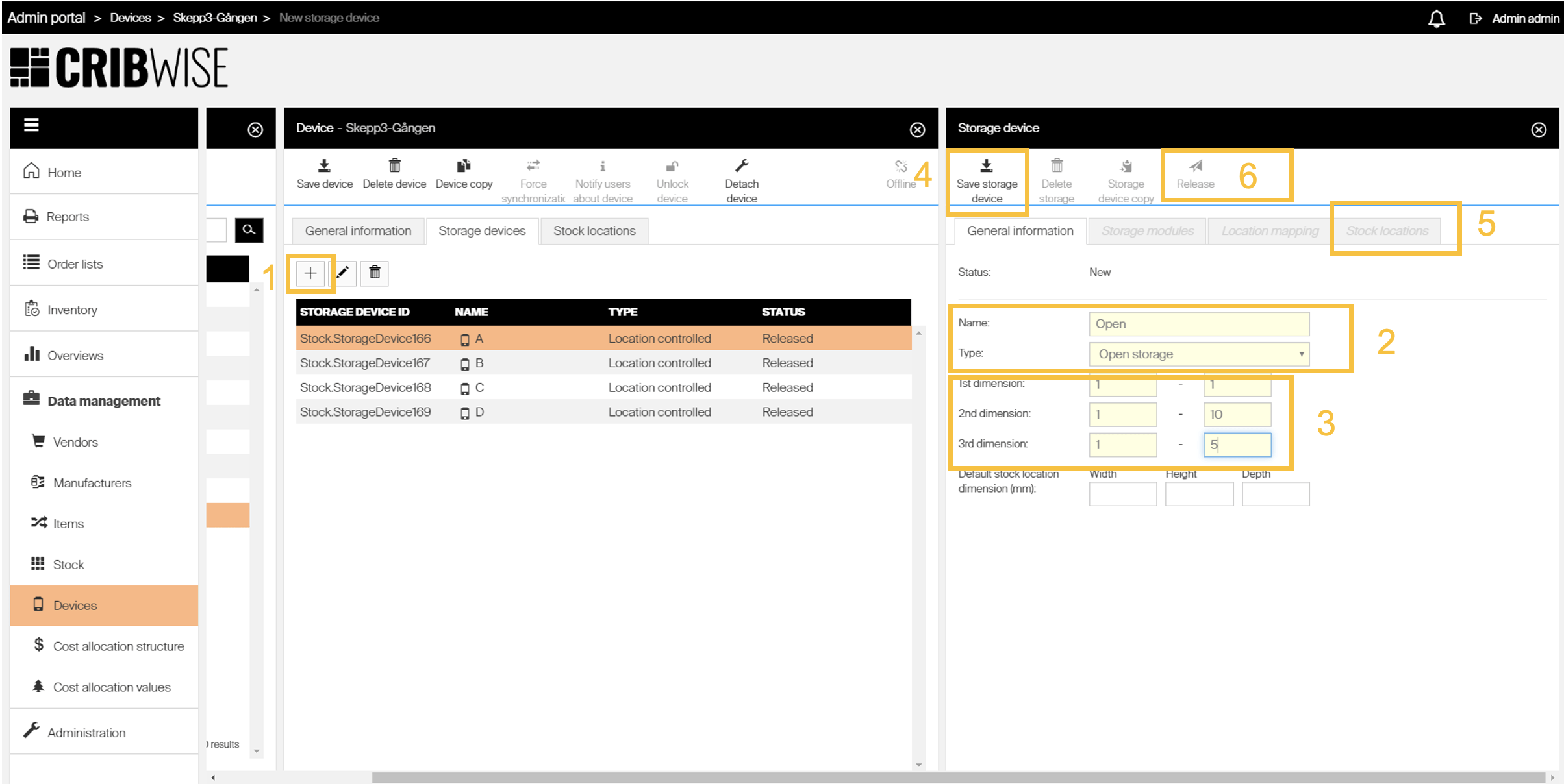 Valid values are numbers (1-x) or characters (A-Z). When storage device is saved, one stock location is created for each step of defined ranges in format Storage device name – 1st dimension – 2nd dimension – 3rd dimension, for example Black shelf – 1 – A – 1.