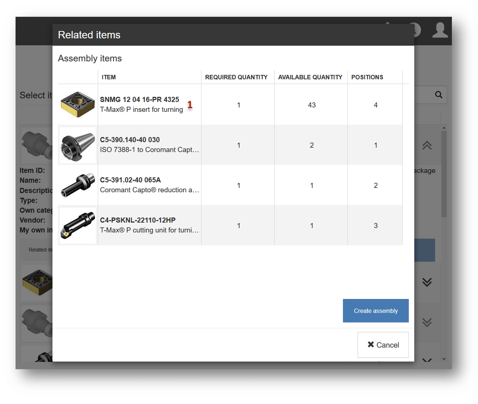 For existing assemblies, required consumable items can be listed and picked. To pick required consumable item, show related items for assembly from list of items or from quantity selection step during pick. Click on required consumable item to select this item for pick.