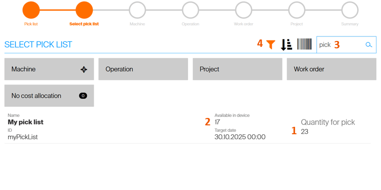 (1) and cannot be changed. If not, all steps to select cost allocation needs to be performed, as described in picking flow. Pick list summary shows all items defined in the pick list with required quantities