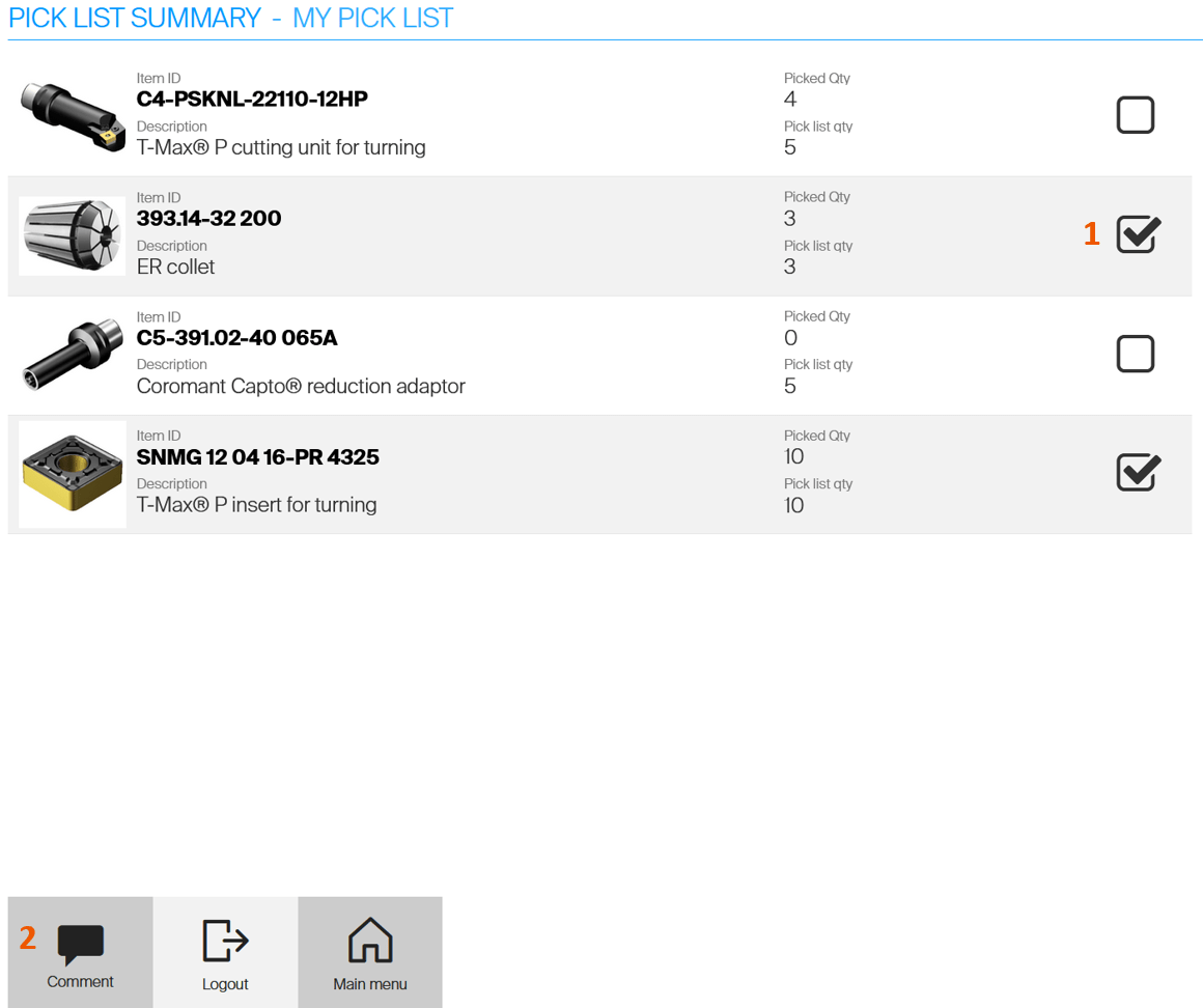 When predefined pick lists are used, pick according the list can be selected to get list of items and their required quantities. To start pick according predefined pick list, select Pick list from main menu.