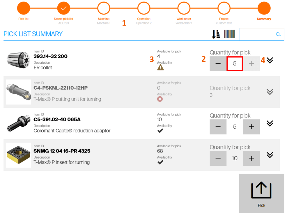 (3). Items available fully according required quantity are marked as ok. Items partially available are marked as warning and items not available at all (including items not assigned in this device) are marked as error. Touching not available item will show information, where this item can be found within all stocks and production. If pick list allows to change quantity for pick, plus and minus buttons are available to specify different quantity than required by the pick list. Pick list may allow to pick more items than requested. In such case, plus button is available to increase quantity for pick up to quantity available for pick. If this option is not allowed by a pick list, it is not possible to increase quantity for pick above the quantity defined by the pick list. To see more information about item (like its related items or item documents), click on the item line or expand the line