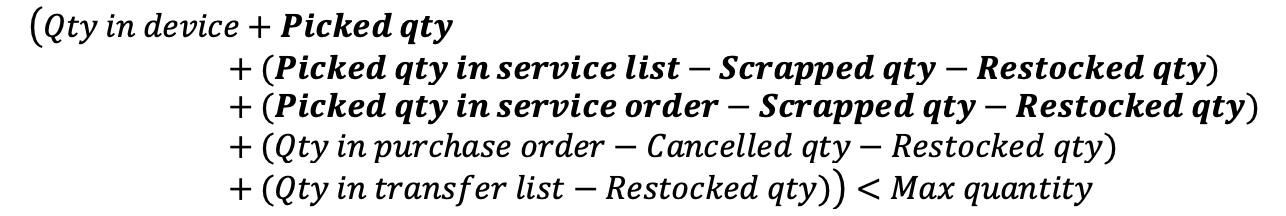Rule is fulfilled when available quantity of item in device (including picked durable items and items in service list/order) is bellow maximum quantity. Quantity ordered is determined to obtain items to reach maximum quantity.