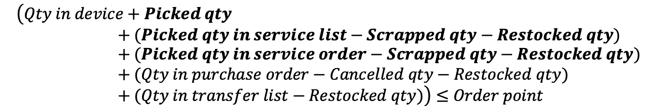 Rule is fulfilled when available quantity of item in device (including picked durable items and items in service list/order) is at or below order point. Quantity ordered is determined to obtain items to reach maximum quantity.